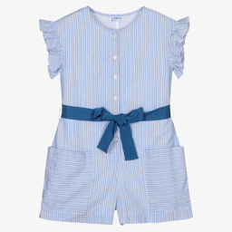 A lovely pink and white striped playsuit for girls by Mayoral, made in soft and lightweight cotton. It has cute frilly shoulder trims and an attached pink ribbon belt. It fastens with front buttons and has two front pockets.