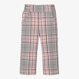 Purple and ivory check trousers for girls by Mayoral, made in a soft viscose blend, with shades of yellow, green and beige. These wide leg trousers have slanted front pockets and an elasticated waistband.