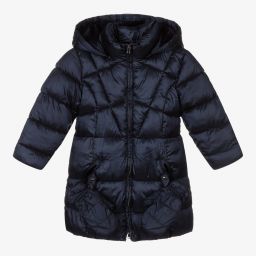 Red puffer coat for girls by Mayoral, made in silky polyester, with a soft plush faux fur lining. The light padding is made from recycled polyester and the coat has a detachable hood, zip fastening front pockets, and matching, detachable, cosy mittens.