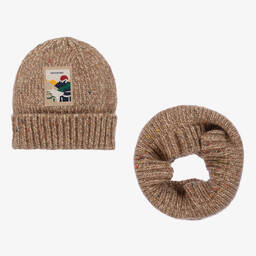 Navy blue hat and snood set for teen boys by Mayoral, knitted with yellow, red and green specks. Ideal for colder temperatures, the cool beanie has a turned-up brim and a mountain-themed adventure patch on the front. For a coordinated look, the matching snood sits comfortably around the neck to stop the cold getting in.