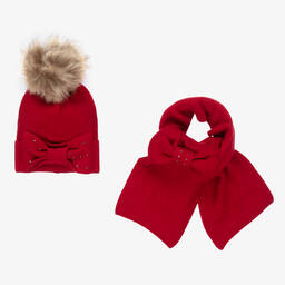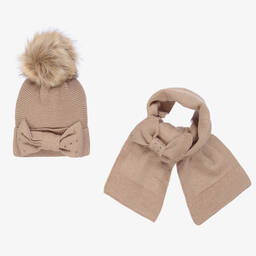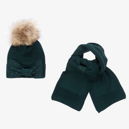 Dark grey hat set for teen girls from Mayoral, made in a soft viscose blend for softness and warmth. The beanie hat has a ribbed brim and a large faux fur pom-pom on top. Both the hat and the scarf have decorative bows with diamanté trims for a sparkly effect.