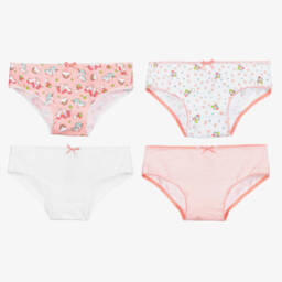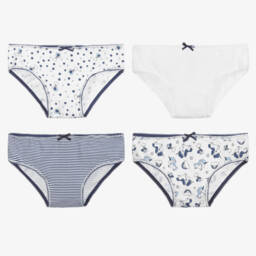 Teen girls light blue cotton knickers (4 pack) by Mayoral, available in limited quantities. Crafted from soft cotton jersey, these knickers feature charming designs including cartoon girl faces, hearts, abstract spots, and polka dots. Each pair is adorned with silky ribbon bows, sweet picot trims, and a comfortable elasticated waistband, offering both style and comfort. Last chance to buy this lovely pack of four, perfect for everyday wear.