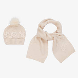 Teen girls teal blue hat and scarf set by Mayoral, beautifully embroidered with tonal flowers. Made in a soft knit, the hat has a turned-up brim and a faux fur pom-pom on the top. The matching scarf wraps around the neck for added warmth in the cold weather. Environmentally conscious, these items contain recycled fibres.