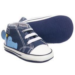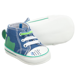 White pre-walker trainers for baby boys and girls by Mayoral Newborn, with a green crocodile and bird design. They have faux laces and fasten with velcro on the heel.
