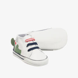White pre-walker trainers for baby boys and girls by Mayoral Newborn, with a green crocodile and bird design. They have faux laces and fasten with velcro on the heel.