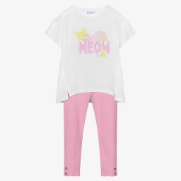 Fun leggings set for girls by Mayoral, made in comfortable cotton jersey. The white T-shirt has a cat and butterfly print in red, navy blue and grey with shiny silver dots. It has a vented front panel that is slightly shorter than the back. The ribbed red leggings have decorative wood-effect buttons on the frilled cuffs.