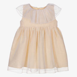Girls blue stripe dress by Mebi is a charming choice with its knitted bodice and delightful ruffle collar. The lightweight seersucker skirt is perfect for warm days and features a lovely striped design. Mother-of-pearl buttons add a touch of elegance, and it comes complete with matching knickers. Ideal for spring and summer outings, enjoy the last chance to buy this beautifully crafted piece with limited quantities available.