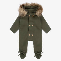 Cosy dark blue knitted pramsuit for baby boys and girls by Spanish brand, Mebi. This snuggly pramsuit fastens with wooden buttons on the front and has sweet bows on the feet. It comes with a detachable brown faux fur hood trim for a luxurious finish.