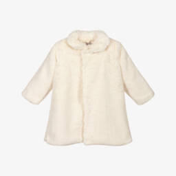 Lovely beige coat for younger girls by Spanish brand Mebi, made in cosy teddy fleece. Simply styled with a sweet rounded collar and a gentle A-line shape, it has a soft knitted lining and double-breasted button fastenings.