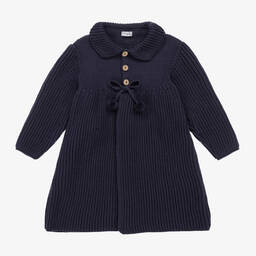 A pink knitted coat for little girls by Spanish brand Mebi. Traditionally styled, this cosy layer has a neat collar, wood-effect button fastenings and a drawstring tie waist. Mebi is a very small fitting brand, please choose a size up to allow room to grow.