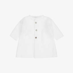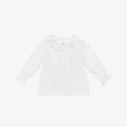A delightful white knit babygrow with collar for girls by Mebi is crafted from soft cotton. This timeless piece features a charming ruffle collar with a subtle stripe pattern, adding a touch of elegance. The scalloped trims and back fastening with mother-of-pearl buttons enhance its classic appeal. Perfect for spring and summer, it ensures comfort and ease of wear for little ones. Limited quantities available, so don't miss the chance to add this exquisite piece to your collection.