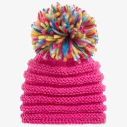 Girls black hat by American designer Michael Kors, knitted from a soft blend of cotton and wool yarn. In a chunky ribbed knit, it has a super soft black faux fur pom-pom on the top. There is a turned-up brim and the signature MK logo in gold metal on the front.