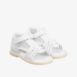 Girls gold faux leather sandals by Michael Kors Kids feature a metallic finish for an elegant touch. The ivory back showcases a gold MK logo pattern, complemented by a gold metal logo on the Velcro fastening strap. Metallic gold and silver straps across the toes and cushioned insoles ensure comfort. These stylish sandals are finished with non-slip rubber outer soles for safety. Last chance to buy, limited quantities available.
