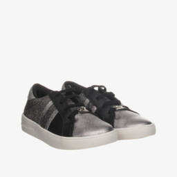 Ivory trainers for girls by Michael Kors, with metallic gold trims and a repeated all-over MK logo design. With sparkly elasticated laces, these classic, sporty trainers have a branded velcro strap and the designer's initials appliquéd on one side. Set on thick rubber soles, they have a soft textile lining, with a padded insole for comfort.