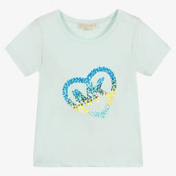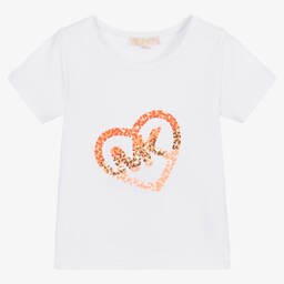 Girls pink T-shirt from American brand Michael Kors, made in soft cotton jersey. Timelessly stylish with short sleeves and a crew neck, it has a heart logo on the front made from pink and silver sequins for a touch of sparkle.