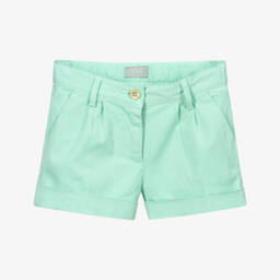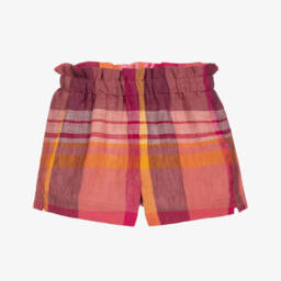 Off-white denim shorts for girls by Michael Kors. With a slight stretch for comfort, they have frayed hems for a casual beach vibe and gold chain detail on the pockets for a touch of glamour. They fasten with a gold-coloured button and zip and have five pockets, belt loops and an adjustable waistband for fit.