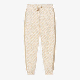 Brown joggers for teen girls by American designer Michael Kors Kids, patterned with the brand's repeat signature logo in contrasting beige. As seen in the main collection, they have sporty red side trim with black repeat logos. They are made in stretchy jersey, with a comfortable drawstring waist and three useful pockets.