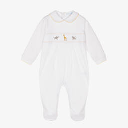 Pale pink babygrow for girls from Mini-La-Mode, made in Pima cotton jersey to be super soft against delicate skin. It has a hand-smocked panel across the chest with an embroidered Jemima Puddle Duck in the middle for a cute look. There are easy-to-use popper fastenings on the back and between the legs for quicker changes.