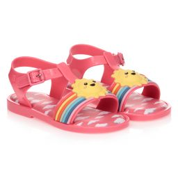 Girls blue jelly sandals by Mini Melissa, made in sweet-scented, soft and durable PVC. These fun sandals have a white cloud motif across the front and rainbow coloured foot strap. They fasten with a velcro ankle strap with decorative buckle.