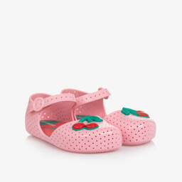 Girls beige bow bar shoes by Mini Melissa feature a charming perforated dot pattern and a delightful pink bow detail. Crafted from the brand's sweet-scented Melflex rubber, these shoes offer durability and comfort. An easy Velcro strap ensures a secure fit, while the cushioned insole and flexible, non-slip outsole provide lasting comfort. Perfect for spring and summer outings, these shoes are available in limited quantities, making this your last chance to buy this adorable addition to any wardrobe.