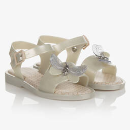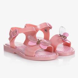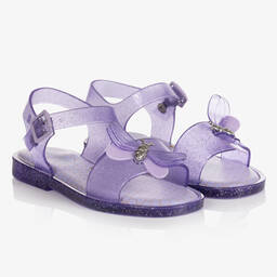 Orange glitter sandals for junior girls by Mini Melissa. They are made in sweet-scented Melflex® PVC, with a sparkly gold bug decoration across the toes. Super comfortable and flexible, these buckle fastening sandals have softly padded insoles and a small heel. There is a non-slip rubber sole for a sure grip.
