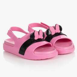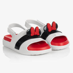 Red Mini-Disney Cloud sandals by Mini Melissa. These cute red shoes have open toes and a velcro closing ankle strap, with a Disney Mickey Mouse bow and ears across the foot strap. Flexible and comfortable, they are made in sweet-scented Melflex® PVC, with a moulded footbed. They have a cushioned inner sole and a non-slip outer sole for grip.