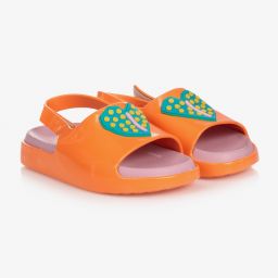 Girls and boys yellow jelly Fábula sandals by Mini Melissa, with a colourful face on the toes. Fábula means 'The Fable' in Portuguese and is a brand with a distinct 'Carioca' (from Rio de Janeiro) feel, making it a perfect collaboration with Mini Melissa. They are made in sweet-scented Melflex®, a recyclable PVC that is both flexible and comfortable. The blue inner soles are moulded for a comfortable fit and there is a velcro fastening strap on the back.