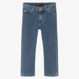 Boys blue wide-leg denim trousers by Mini Rodini offer a stylish and comfortable fit for the autumn and winter seasons. Crafted from soft organic cotton with a slight stretch, these jeans feature a five-pocket design with antiqued gold rivets. The adjustable waistband and button-zip fastening provide ease of wear, while the bold yellow embroidery on the back pockets adds a distinctive touch. Limited quantities available, suitable for everyday adventures.