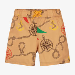 Boys ivory medal swim shorts by Mini Rodini are patterned with branded and gold medals featuring green striped ribbons. Crafted from soft, smooth recycled materials, these shorts include a stretchy mesh lining for added comfort. The elasticated waistband with a front tie makes them easy to pull on. Last chance to buy these stylish and eco-friendly swim shorts in limited quantities.