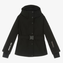 A brown ski jacket for boys and girls by Mini Rodini, with the Swedish brand's panda mascot appliquéd on the chest. Made in waterproof, windproof and breathable technical fabric, it is padded for warmth and has an orange polar fleece lining for cosy comfort. It has a detachable, popper fastening hood with a button-on, super soft faux fur trim. This slope-ready jacket features taped seams, a zip-up ski pass pocket on one sleeve, stretchy internal cuffs with a thumbhole and two zipped front pockets for small items. The contrasting ivory front zip has a fleecy chin guard to prevent rubbing and a light reflective logo is printed on the back for added visibility in severe weather.