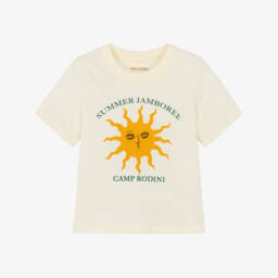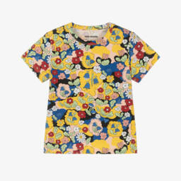 Striped organic cotton T-shirt for boys and girls by Mini Rodini, in pastel shades of pink, yellow and blue. Made from lightweight jersey, this casual piece has a wide neck collar and short sleeves. A small tab can be seen on the side seam with the brand's signature logo.