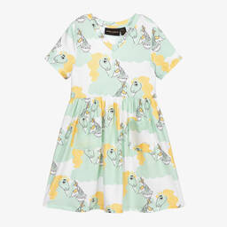 Girls white, V-neck jersey dress by Mini Rodini. It has cute yellow and pink unicorn print with 'best noodle' written in Korean scripts. Soft and stretchy with patch pockets on the front, it is made from sustainable and eco-friendly Lyocell.