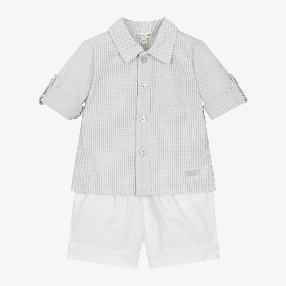 Smart-casual grey and white cotton shorts set for baby boys by Mintini Baby. With a delicate check design, the classically styled shirt is made in lightweight seersucker, with a chest patch pocket and branded button fastenings. It has button tabs on the long sleeves to easily adjust the length. Made in lightweight twill, the shorts have useful pockets and a gently elasticated waistband.