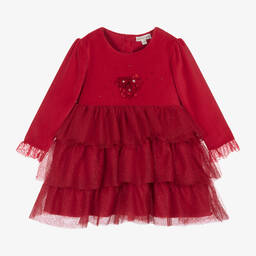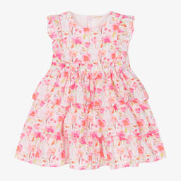 A pale pink dress for baby girls by Mintini Baby, with a lovely, decorative bow on the back. Pretty and delicate, the silky fabric is embossed with a floral pattern. The bodice features a shirred cotton panel designed to look like smocking, with mother-of-pearl faux buttons. This lovely dress has floral lace trims on the collar, a logo plaque on the waist, and button fastenings on the back.