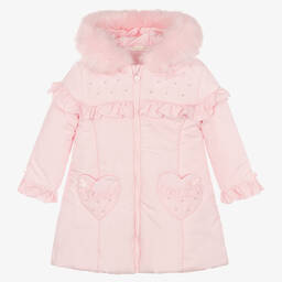 Pretty pink coat for girls by Mintini Baby. Silky smooth and lightly padded for warmth, it has a quilted bodice with sparkly sequins for a touch of glamour. Ruffles on the shoulders and a peplum waist with sweet bow details add a feminine look. The coat fastens easily with a zip and has a useful detachable hood.