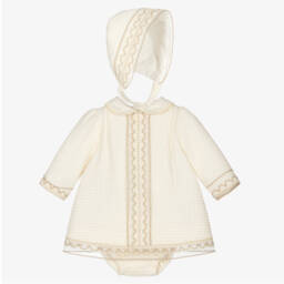 A lovely peach pink dress set for baby girls by Spanish brand, Miranda. Made in soft and lightweight cotton, it has beautifully embroidered white lace detailing with ruffle trims. There is a popper removable floral corsage on the front. The dress fastens on the back with buttons and it is fully lined in a soft cotton blend fabric. A matching bonnet with button fastening chin strap and knickers completes this charming outfit.