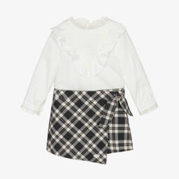 Teen girls red and white top and skirt set by Miranda. The white cotton jersey top has a red and ivory lace ruffle neckline. The full, striped skirt has gathered layers and removable fabric flowers on the waist.