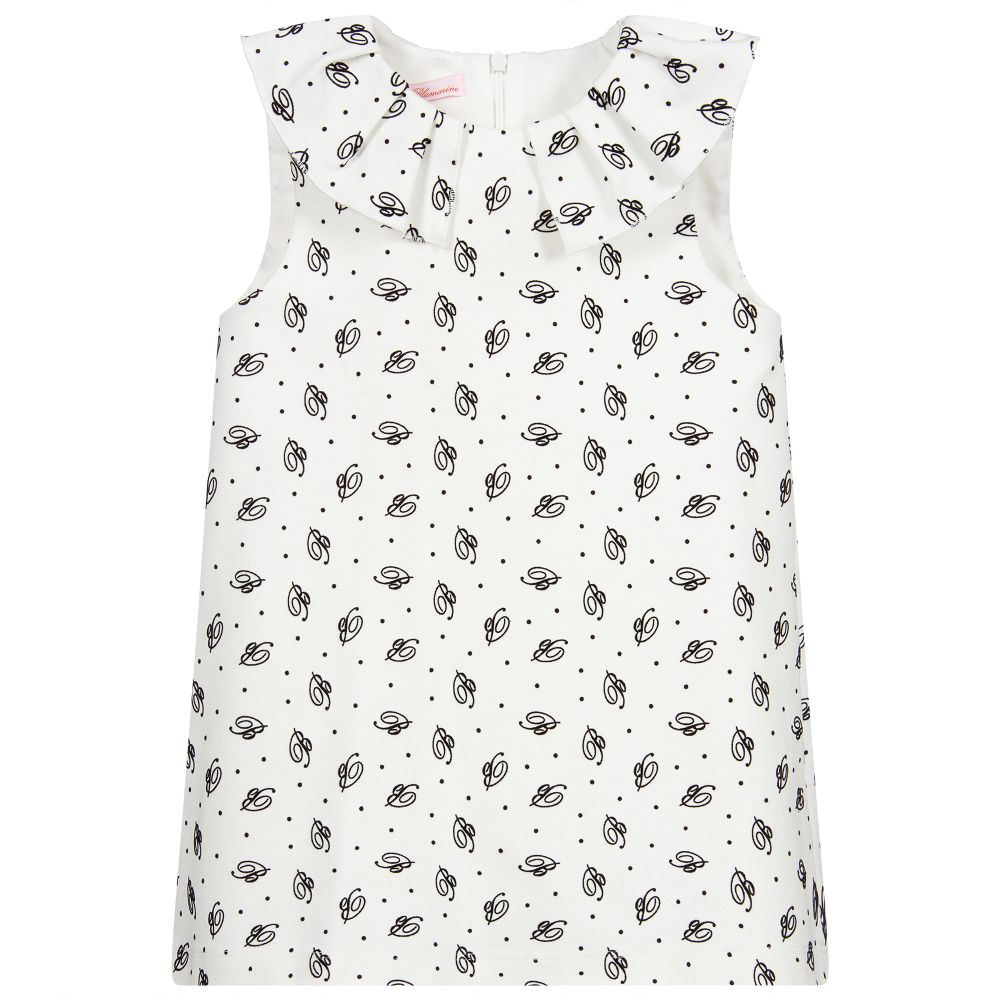 A gorgeous dress for girls in ivory, with a black flocked 'B' logo pattern by Miss Blumarine. Made in mid-weight Milano jersey, it has a lightweight lining, and a pretty split ruffle collar.