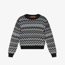 Boys black zigzag cotton sweater by Missoni is beautifully knitted from luxurious soft cotton yarn, featuring the brand's iconic zigzag stripes with a splash of lime green, white and blue. This long-sleeved style has a subtle, slubbed texture in the knit, and a rubberised logo patch by the hem for a cool, casual look. Limited quantities available for a smart yet comfortable addition to any wardrobe.