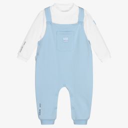 Cute blue and white dungaree set for baby boys by Mitch & Son, made in soft cotton. The white jersey polo shirt has pale blue trims and a button-up collar. The blue and white striped seersucker dungarees have button flap details on the sides and a white logo patch on the front. There are button fastenings on the shoulder straps and poppers between the legs.