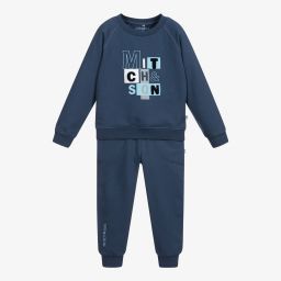 Pale blue tracksuit for boys by Mitch & Son, with embroidered and printed logo branding. Lightweight, it is made in soft cotton jersey, with a warm fleecy inside. The joggers have an elasticated drawstring waistband.