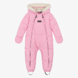 A navy blue puffer snowsuit for baby boys and girls by Mitty James, exclusive to Childrensalon. Warm, cosy and showerproof, it is generously padded, with a teddy fleece-lined hood, a comfortable cotton jersey lining and detachable, jersey-lined mittens secured with poppers. Smaller sizes have feet, whilst larger sizes have elasticated leg cuffs to keep the warmth in and detachable stirrups to keep the cold out. Easy to wear, the snowsuit has double zip fastenings with logo pull tabs and a useful, internal, popper-fastening panel to help with dressing. There is a rubberised grey logo in the centre.