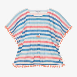 Exclusive to Childrensalon, a pale blue and white striped, hooded romper suit for baby boys and girls by Mitty James. Just right for the pool, beach or after bath time, it is made in comfortable, absorbent cotton towelling. There is a useful pouch pocket on the front with the brand's logo patch and logo taping around the inside of the hood. The romper fastens with easy-to-use poppers between the legs.