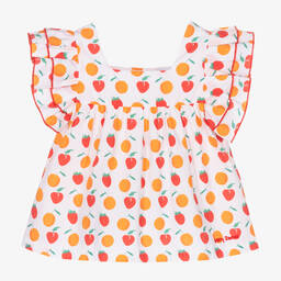 Exclusive to Childrensalon, a lovely white blouse for girls by Mitty James, with a yellow sunshine print. Made in soft, comfortable cotton poplin, it has pretty, tiered, ruffled sleeves and fastens with buttons around the back.