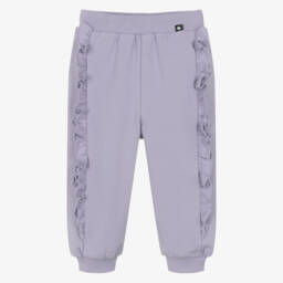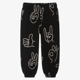 Beige joggers for boys and girls by Danish brand Molo, made in super soft organic cotton jersey. Cool for relaxed wear, these joggers have a black smiling face print, side seam pockets and a faux back pocket. They have an internal drawstring for a comfortable fit around the waist.