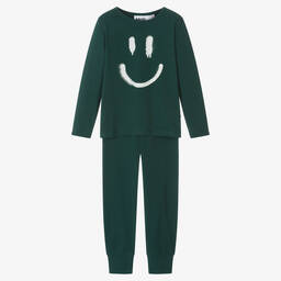 Charcoal grey pyjamas for boys and girls by Danish brand Molo, made from super soft organic cotton jersey. The long sleeved top has a white graffiti-style smiling face print on the front and a logo tab on the side seam. The trousers are cuffed at the ankle and have a comfortable elasticated waist.