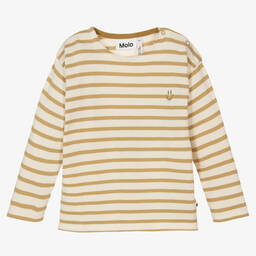 Blue and ivory organic cotton top for little boys and girls by Danish brand Molo. Made in a light knit for all-day comfort, it has a smiley face embroidered on the front in pastel green. There are useful popper fastenings on one shoulder.