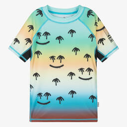 Silky soft and stretchy, a black swim top for boys by Danish brand Molo. It has a blue ocean print on the front, incorporating a whale, squid and colourful jellyfish. Made in recycled fabric, it has a UPF50+ rating, blue overstitch detailing and short raglan sleeves. There is a white logo print on one sleeve and a rubberised logo tab on the side seam.