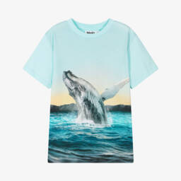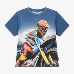 Boys blue short-sleeve T-shirt by Molo features a striking dinosaur print, perfect for young adventurers. Crafted from organic cotton, the soft jersey fabric ensures comfort and breathability, making it ideal for everyday wear. Overstitch detailing on the shoulders adds a touch of style, while the vibrant design captures the imagination. Limited quantities available, so secure this fun and fashionable piece for the little one’s wardrobe today.