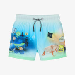 Boys blue volleyball swim shorts by Molo feature a vibrant print of volleyballs in various shades, capturing the playful essence of beach life. Crafted from recycled polyester with elastane for a comfortable stretch, these shorts offer both style and sustainability. An adjustable drawstring waist ensures a perfect fit for active days by the water. With limited quantities available, now is the perfect time to secure these stylish swim shorts for the upcoming season.
